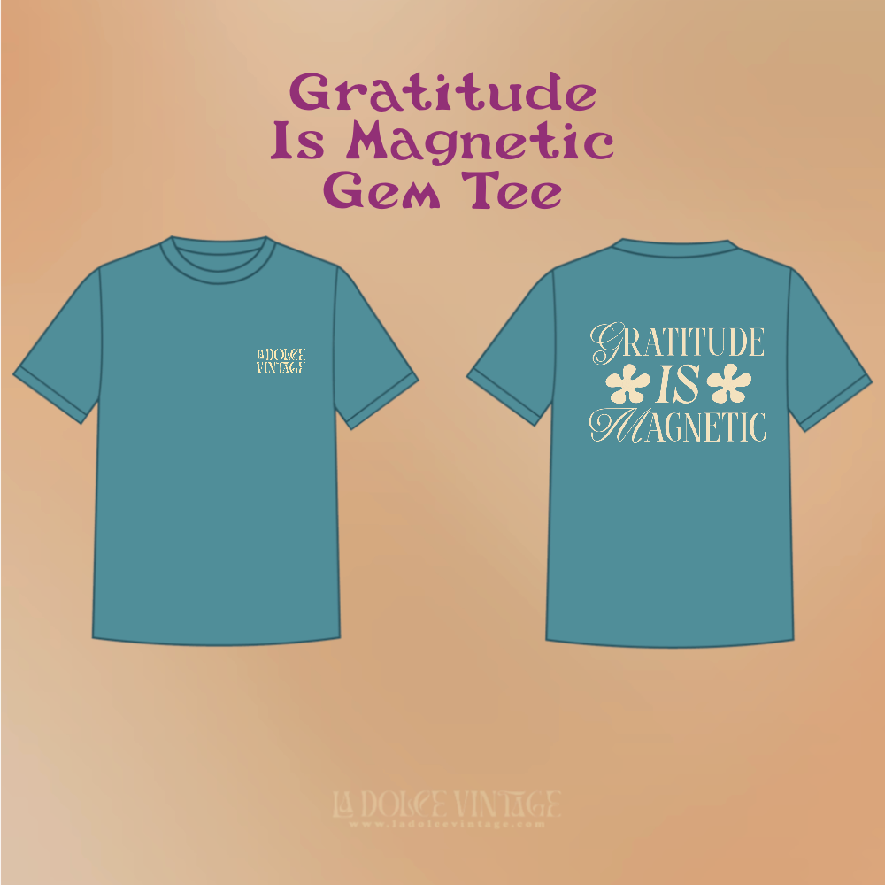 Bring good vibes wherever you go! Our Emerald gem tee features the uplifting phrase “Gratitude is Magnetic” in Cream, making it a playful, chic addition to any wardrobe.