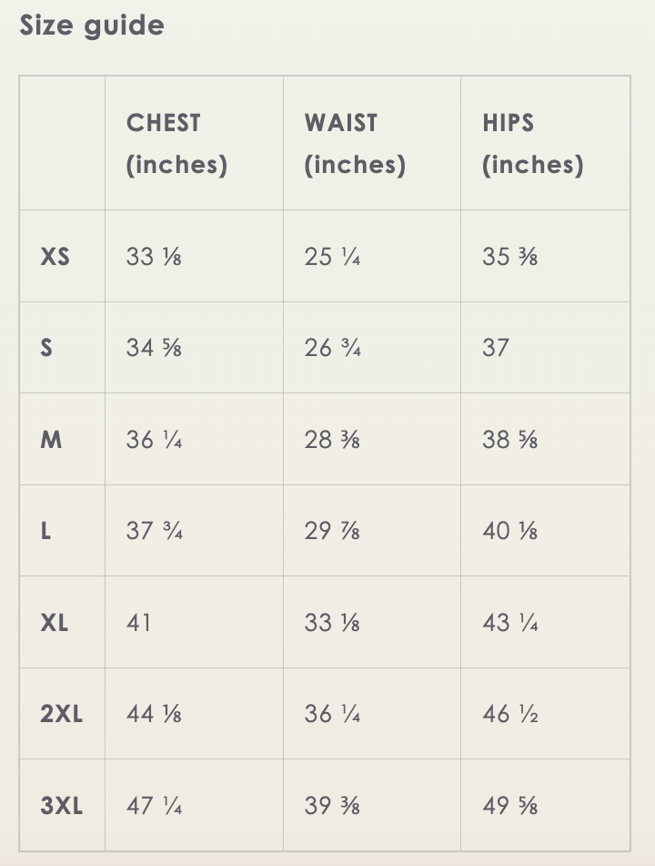 | CHEST (inches) | WAIST (inches) | HIPS (inches) | |